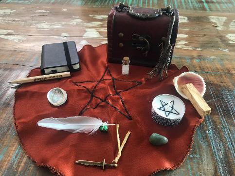 Een reisaltaar-kistje bevat: een altaarkleed met pentagram, de 4 elementen (aarde: flesje zout, water: schelp, lucht: veer met belletje, vuur: waxinelichtje), mini athame, steen, heilig hout of wierookkegeltje met schelp. (Optioneel mini book of shadows en potloodje tegen meerprijs indien leverbaar)